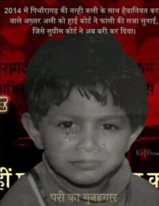पिथौरागढ़- ( उत्तराखंड) नन्ही परी कशिश से दरिंदगी करने और उसकी हत्या करने के दोषी को बरी करने से आक्रोशित जिले के विभिन्न हिस्सों के लोग जिला मुख्यालय पहुंचे। लाडली को न्याय दिलाने की मांग पर हजारों की भीड़ सड़कों पर उतरी। लोगों ने रामलीला मैदान से कलक्ट्रेट तक जुलूस निकाला।इस दौरान भीड़ और पुलिस के बीच धक्का-मुक्की भी हुई। लाडली को न्याय दिलाने की मांग पर जिले के विभिन्न हिस्सों से लोग रामलीला मैदान पहुंचे। यहां लाडली के माता-पिता और अन्य परिजनों ने अपना दर्द बयां किया। इसके बाद लोगों ने नया बाजार होते हुए कलक्ट्रेट तक जुलूस निकाला।
