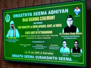 देहरादून। सीमावर्ती क्षेत्रों में स्वास्थ्य सेवाओं को सुदृढ़ करने की दिशा में एक बड़ा कदम उठाते हुए उत्तराखंड सरकार और भारत–तिब्बत सीमा पुलिस (ITBP) के बीच ‘स्वस्थ सीमा अभियान’ के अंतर्गत महत्वपूर्ण समझौता ज्ञापन (MoU) पर हस्ताक्षर किए गए। यह समझौता मुख्यमंत्री पुष्कर सिंह धामी की उपस्थिति में मुख्यमंत्री आवास पर संपन्न हुआ। इस अवसर पर स्वास्थ्य मंत्री धन सिंह रावत और कैबिनेट मंत्री सौरभ बहुगुणा भी मौजूद रहे।